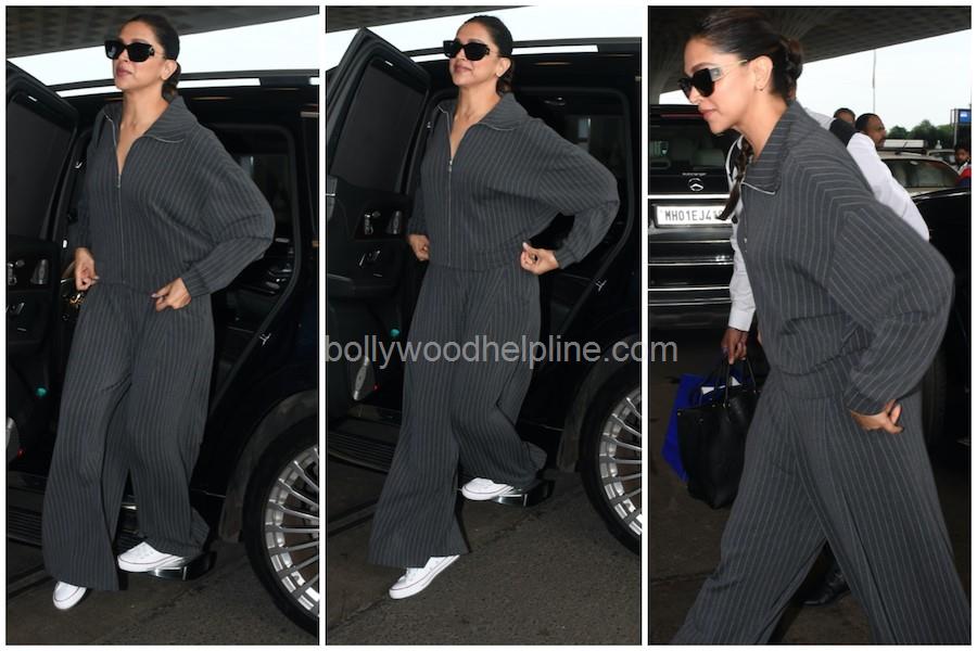Deepika Padukone once again proved that airport style doesn't have to be over-the-top to make a statement. Spotted at Mumbai Airport, the Bollywood icon kept it classy and comfortable in a grey co-ord set that screamed "cool, calm, and in control." The ensemble featured a zip-up collared jacket paired with wide-legged pinstripe trousers—because why not serve boardroom chic at 30,000 feet?