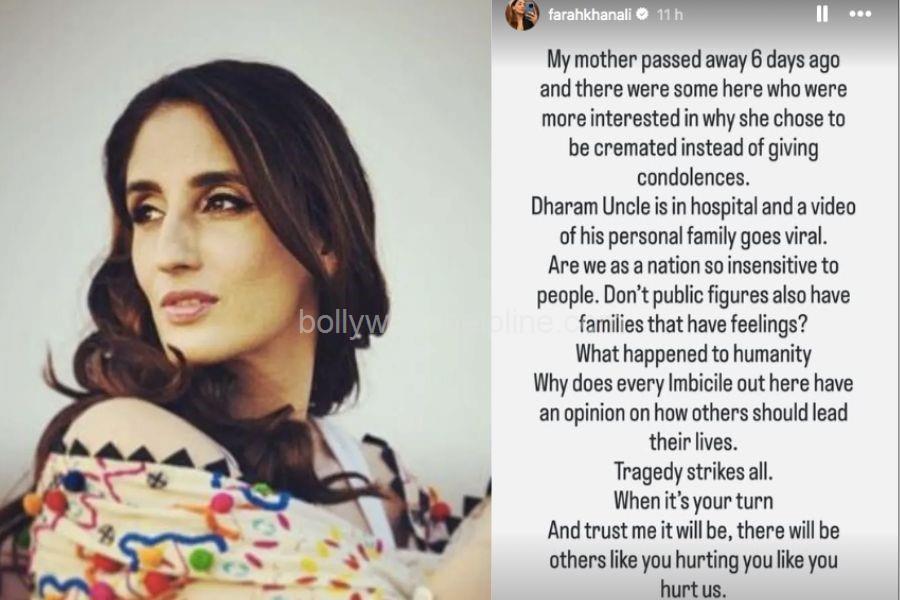 Here is what Farah Khan Ali wrote on social media:“My mother passed away 6 days ago and there were some here who were more interested in why she chose to be cremated instead of giving condolences. Dharm Uncle is in hospital and a video of his personal family goes viral. Are we as a nation so insensitive to people. Don’t public figures also have families that have feelings? What happened to humanity? Why does every Imbecile out here have an opinion on how others should lead their lives. Tragedy strikes all. When it’s your turn and trust me it will be, there will be others like you hurting you like you hurt us 🙏”